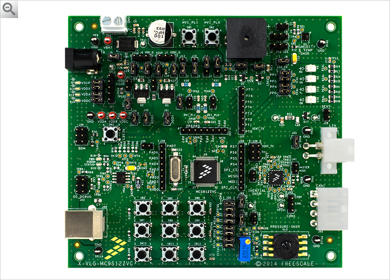 The VLG-MC9S12ZVC features the S12ZVC, an automotive 16-bit MCU family. The MC9S12ZVC family is a new member of the S12 MagniV product line integrating a battery level (12 V) voltage regulator, supply voltage monitoring, high voltage inputs, and a CAN physical interface. It’s primarily targeting at CAN nodes like sensors, switch panels, or small actuators. It offers various low-power modes and wake-up management to address state of the art power consumption requirements.